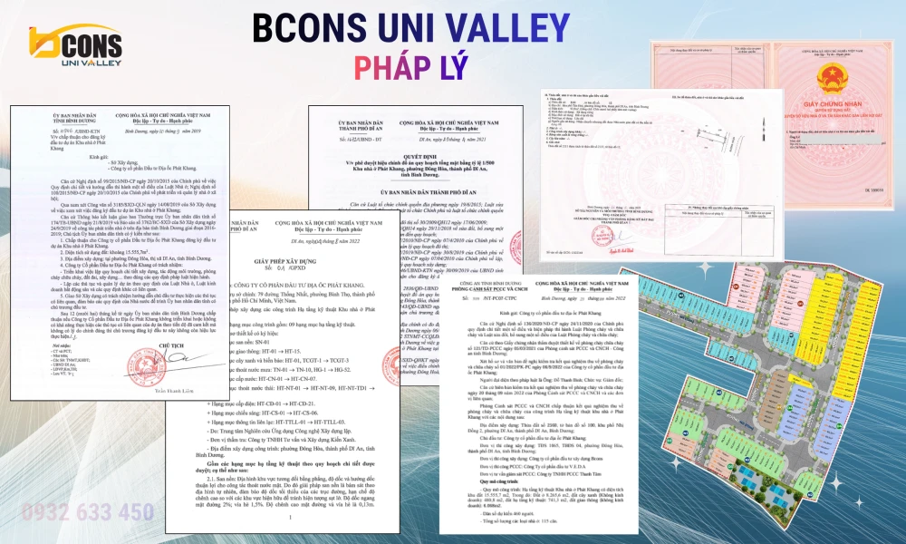Dự án Khu nhà ở Phát Khang – Bcons Uni Valley sở hữu bộ pháp lý hoàn chỉnh và minh bạch, được cơ quan nhà nước có thẩm quyền phê duyệt, bao gồm: