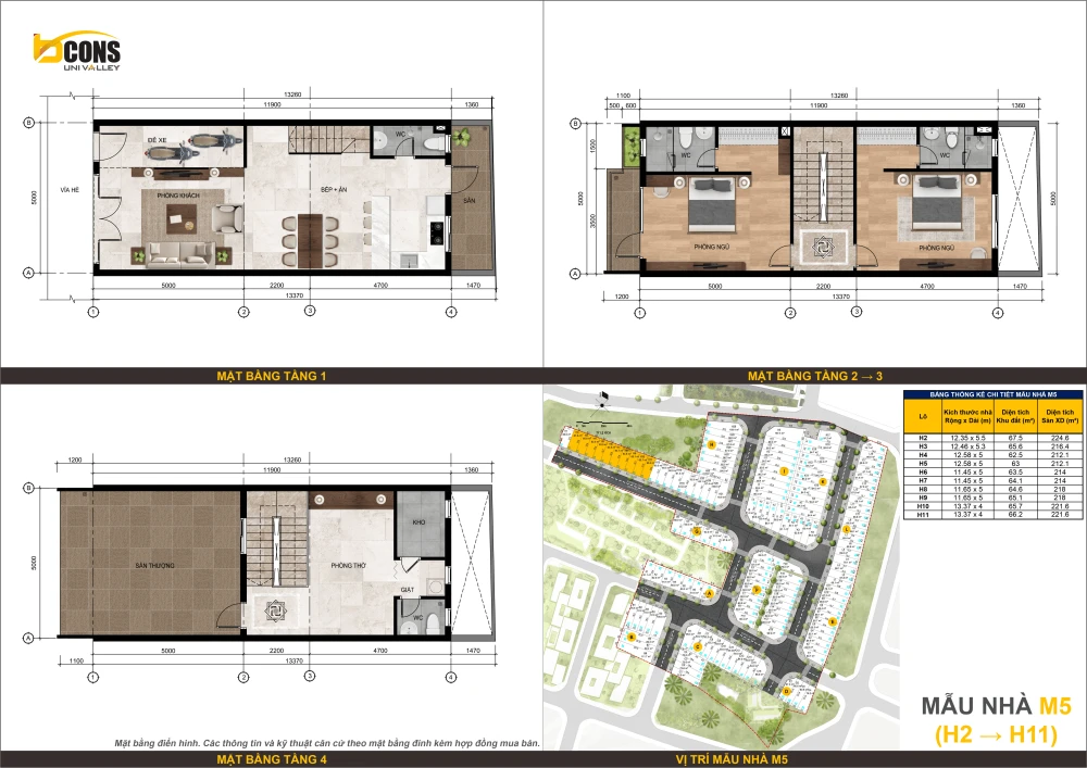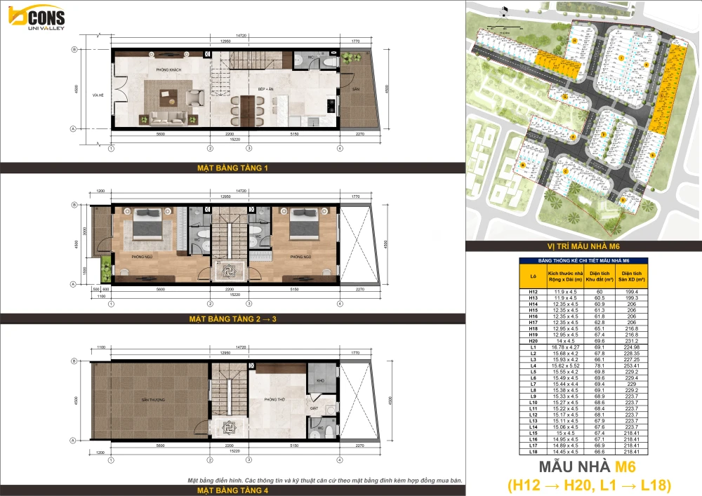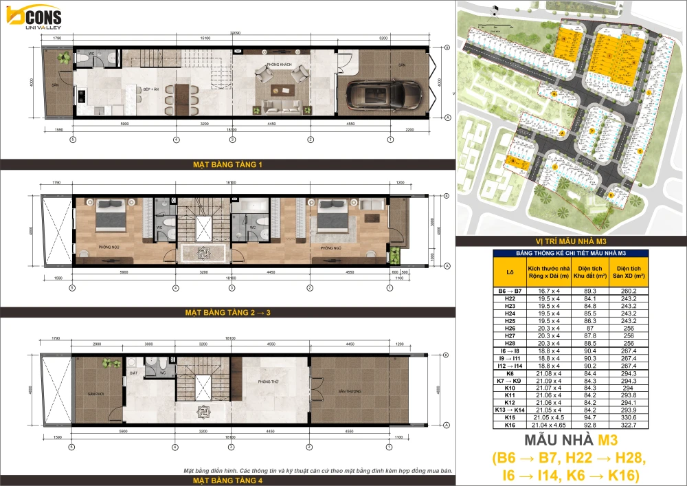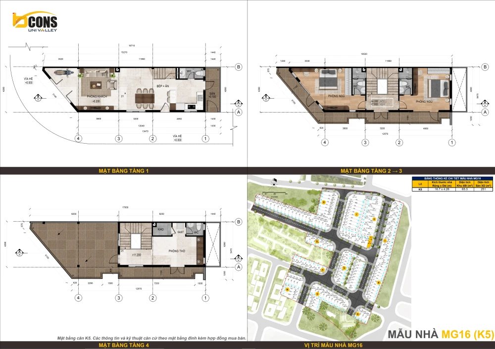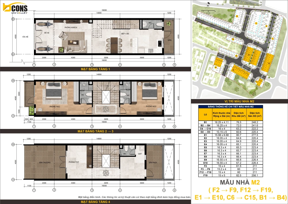 | Diện tích | Đất xây từ 60 – 167 m²; diện tích sàn từ 250 – 400 m² |