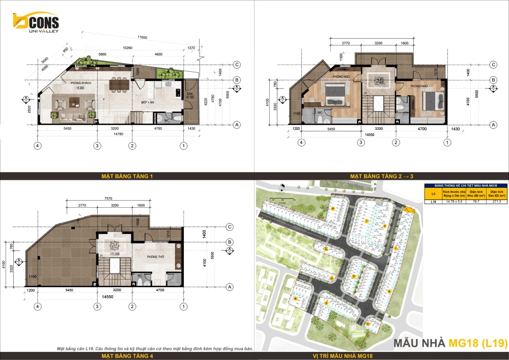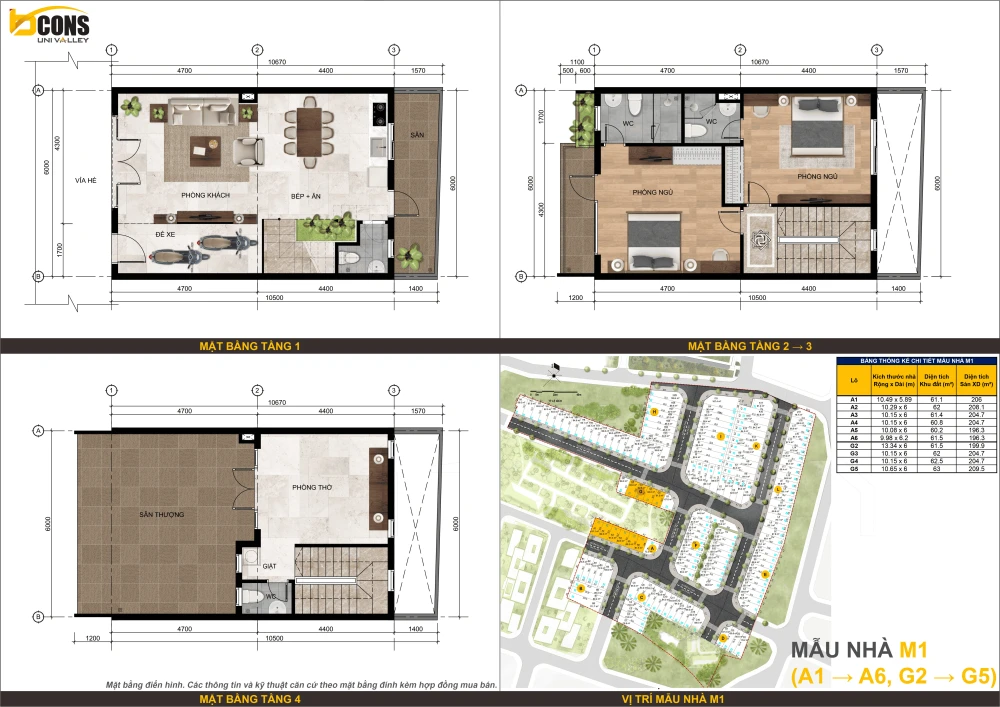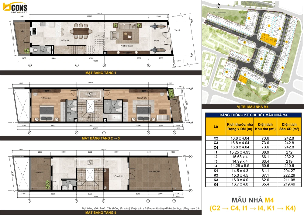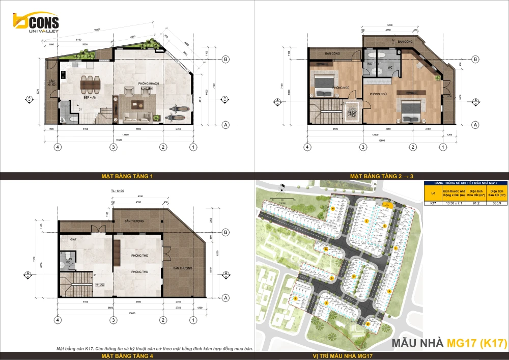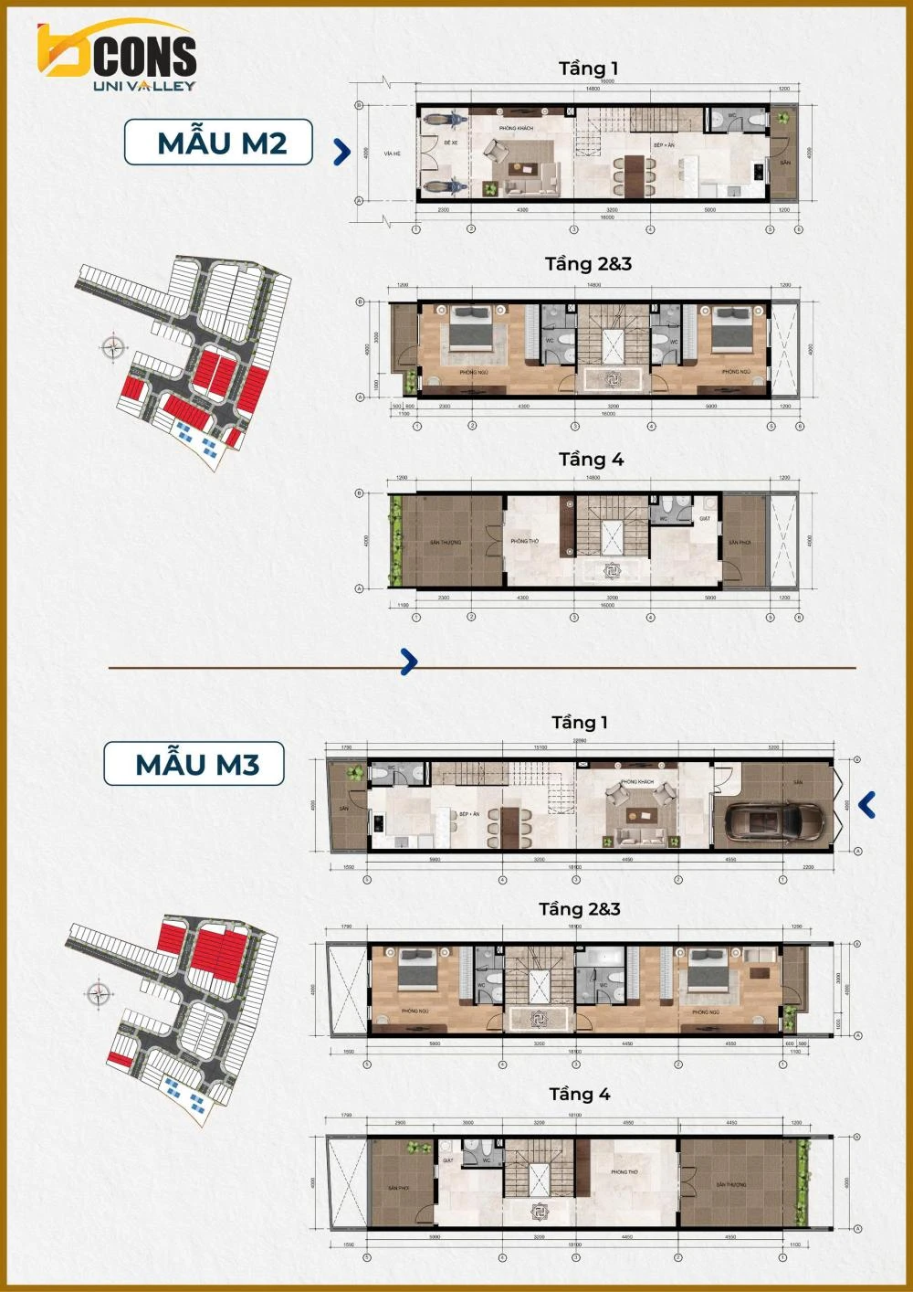 | Diện tích | Đất xây từ 60 – 167 m²; diện tích sàn từ 250 – 400 m² |
