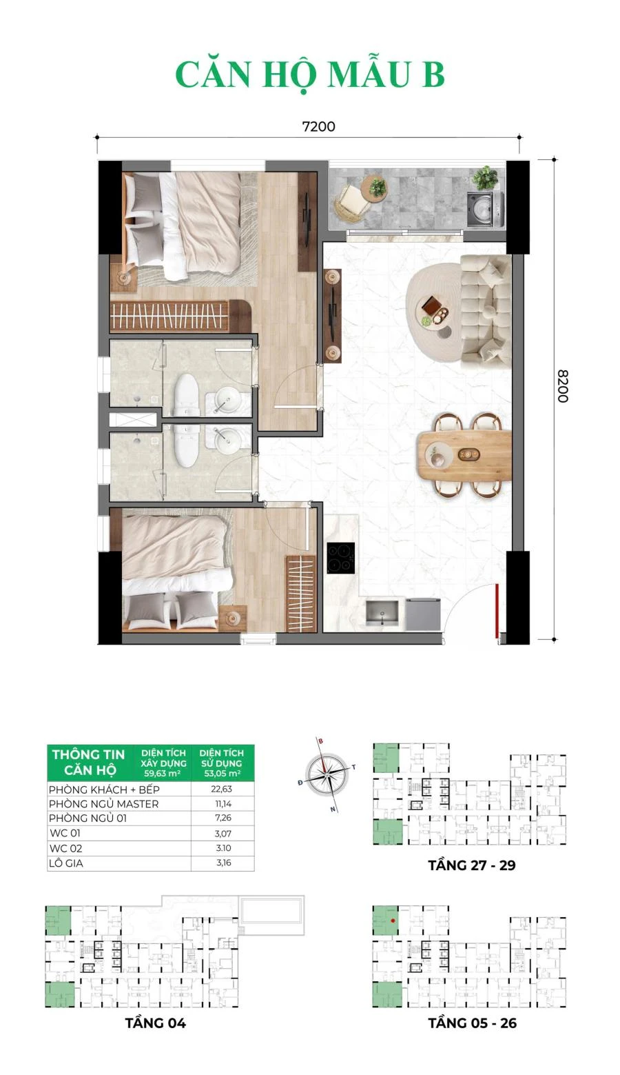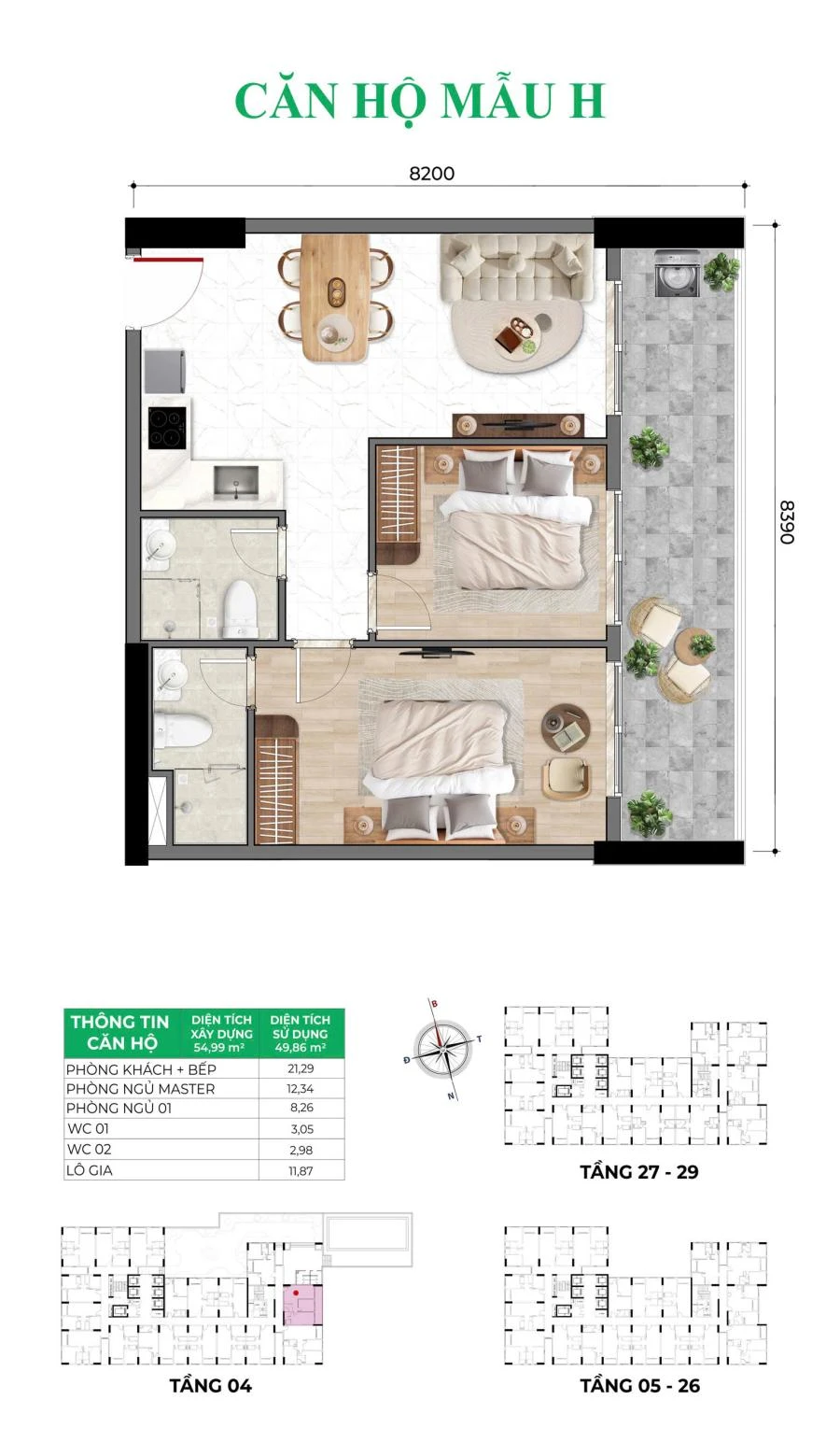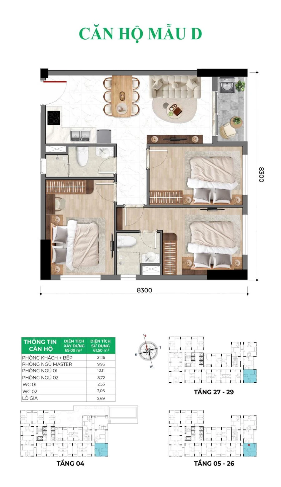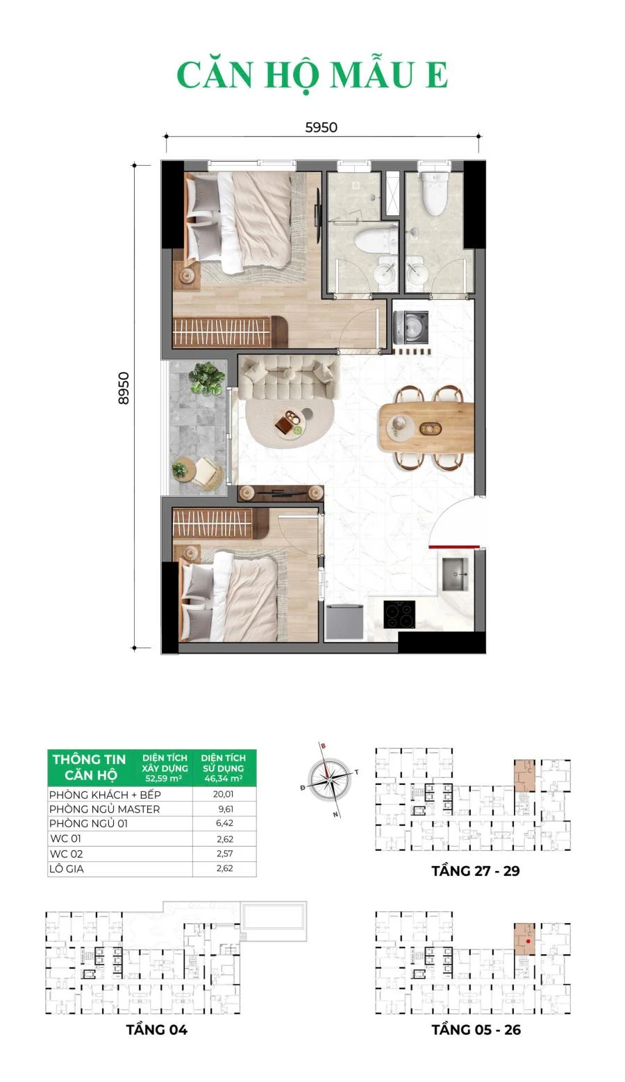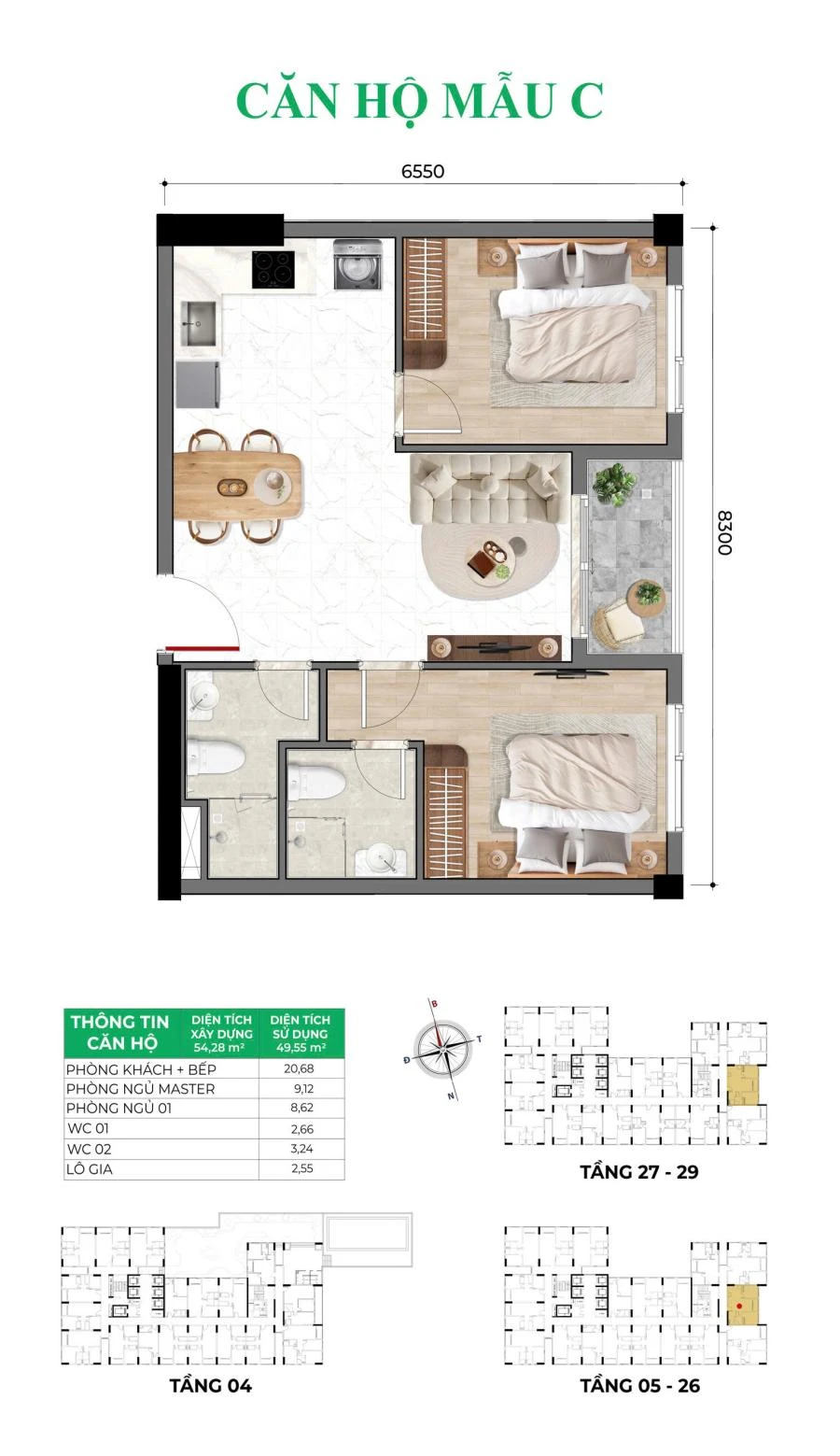 - Căn 2 phòng ngủ: 48m2 – 52m2 – 54m2 – 60m2 – 69m2