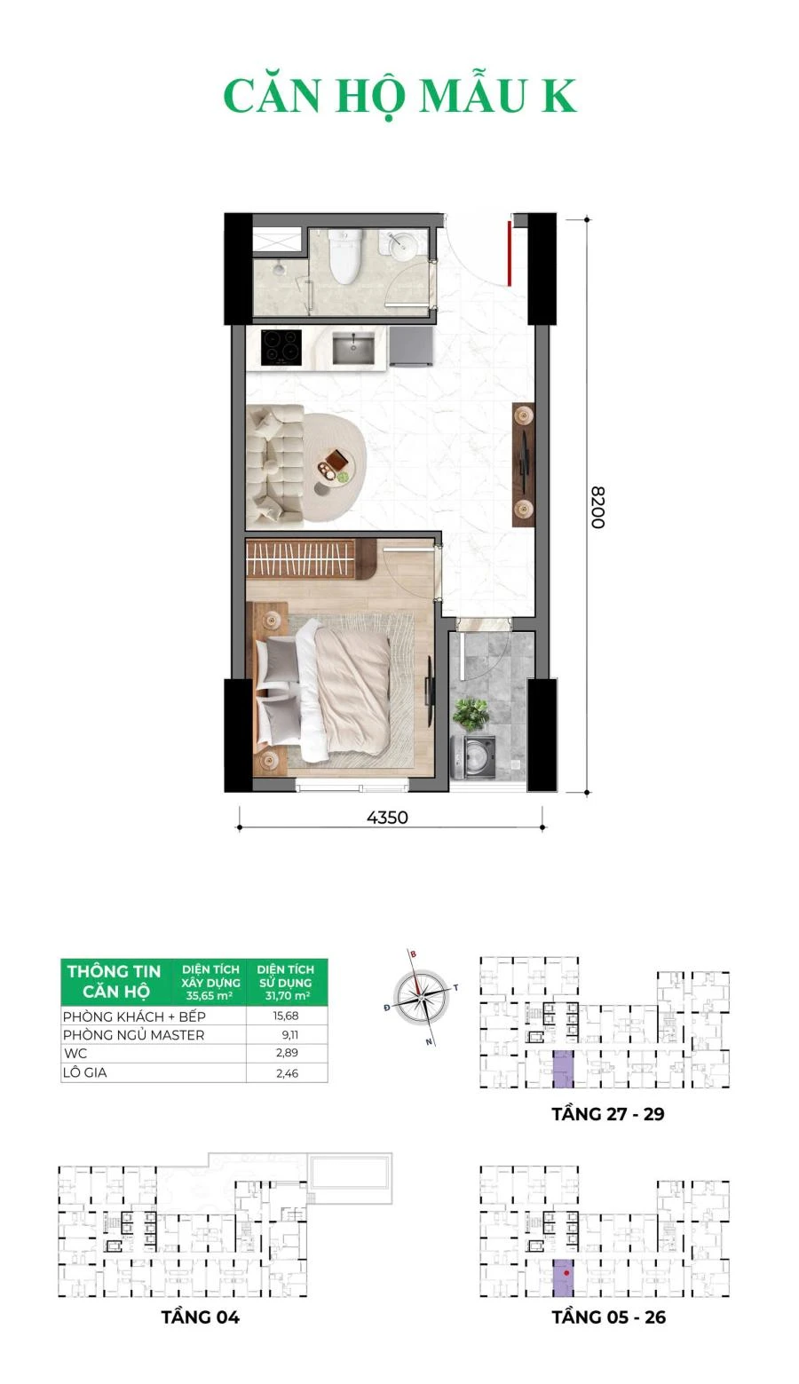- Căn 1 phòng ngủ: 35m2 và 39m2