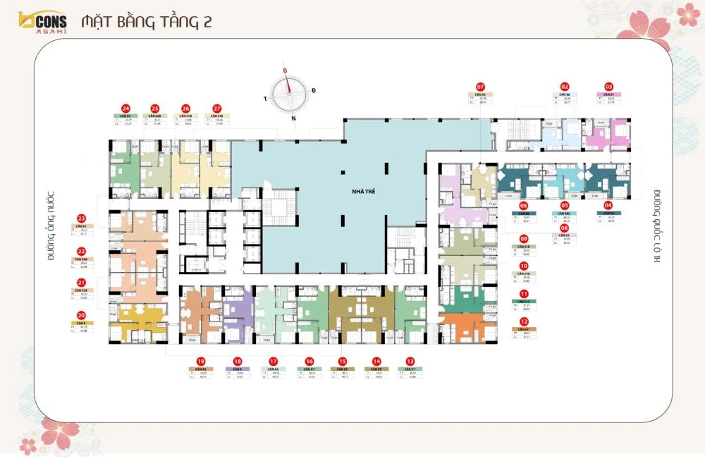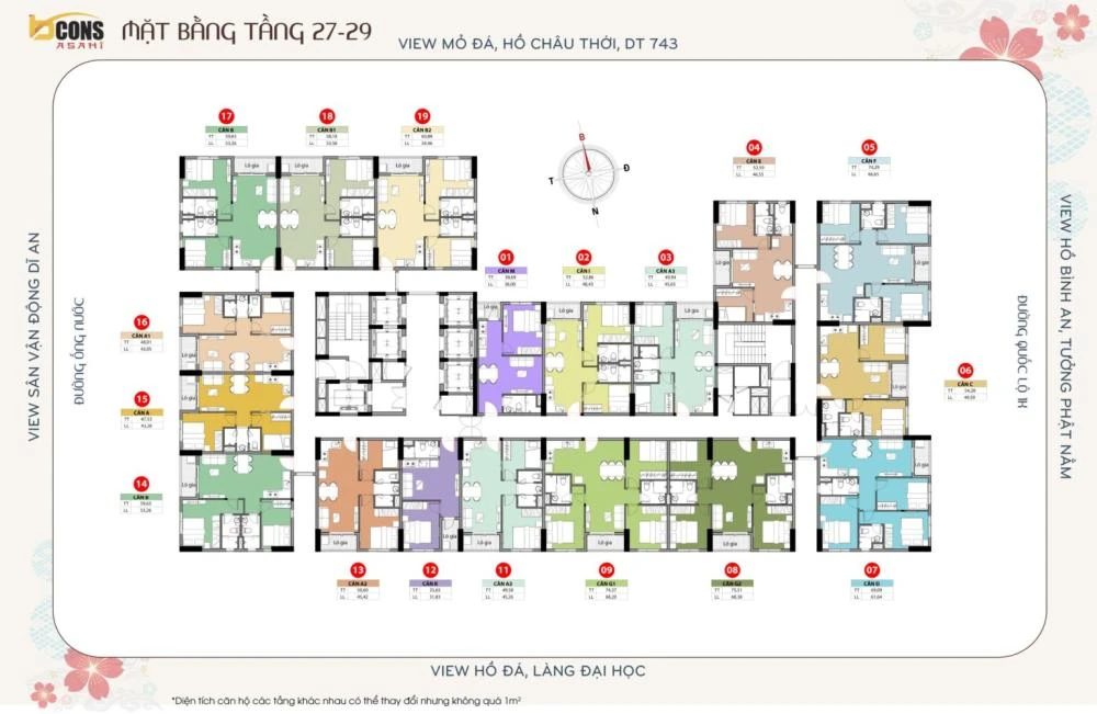 Dự án Bcons Asahi sẽ có các thiết kế căn hộ khác nhau tuỳ theo mỗi mặt bằng tầng. Mật độ căn hộ từ 18 , 19 căn/ sàn, sử dụng 5 thang máy và 2 thang thoát hiểm. Với thiết kế theo phong cách Nhật Bản, dự án đảm bảo tất cả các căn hộ có view nhìn thoáng đãng, đón nắng và gió tự nhiên. Đặc biệt, vấn đề phong thuỷ ở dự án đã được khắc phục chính là không bị đối cửa.