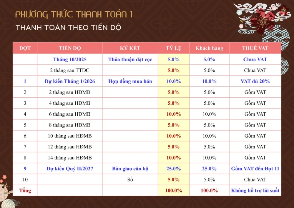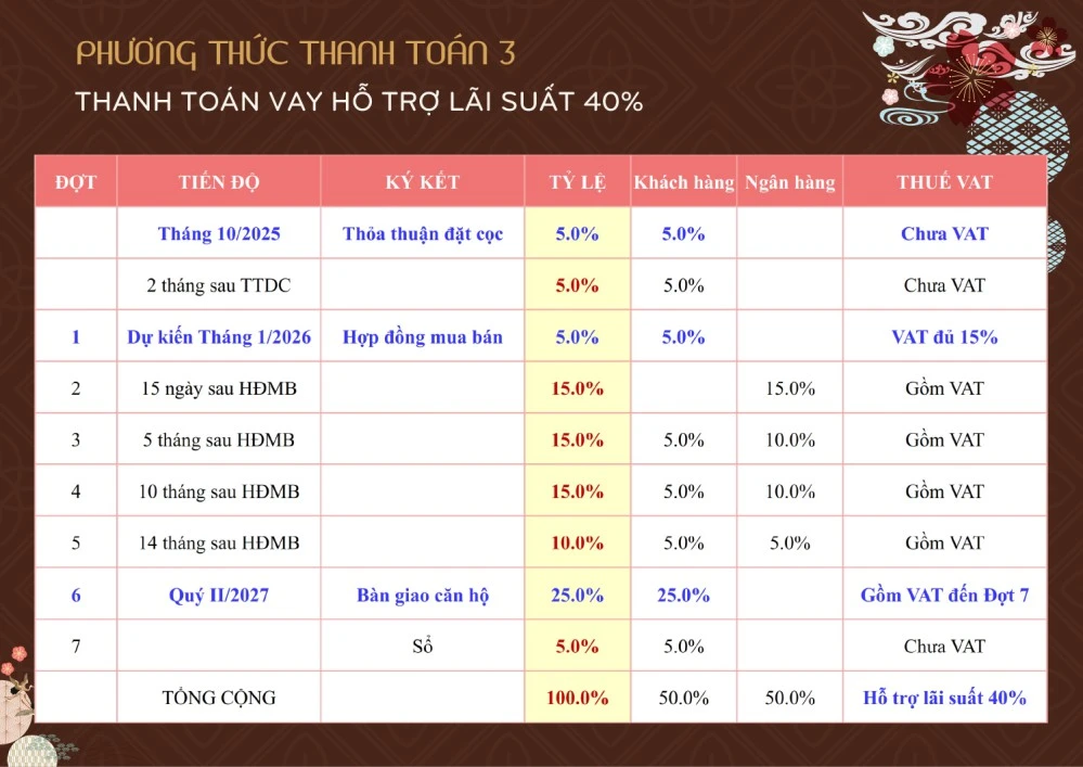 Khách hàng mua dự án được lựa chọn 3 hình thức thanh toán linh hoạt với các chương trình ưu đãi đặc biệt như chiết khấu và hỗ trợ lãi suất 0% đến khi nhận bàn giao nhà.